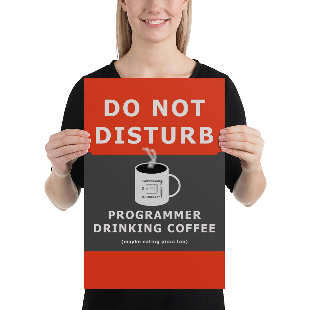 Do not disturb - programmer drinking coffee (maybe eating pizza too) sign. Also with a programming joke: Understand Recursion is Necessary To...