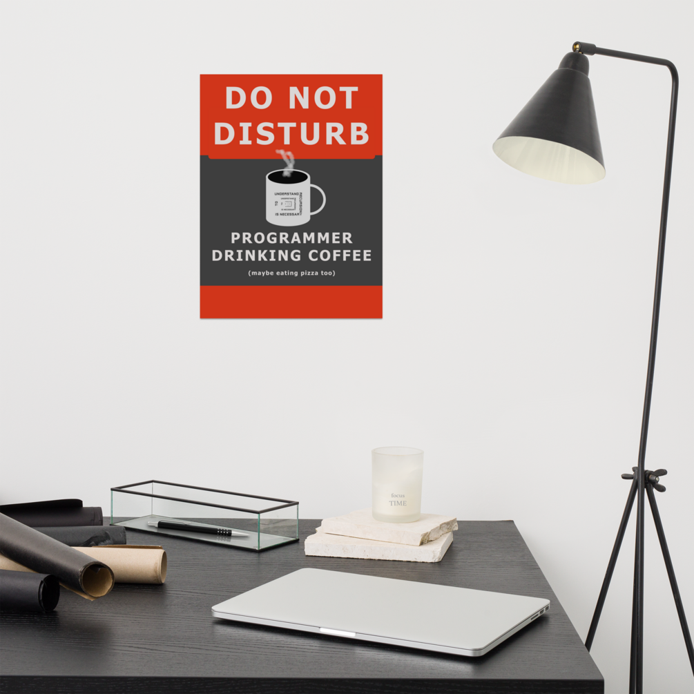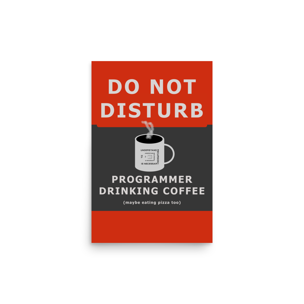 Do not disturb - programmer drinking coffee (maybe eating pizza too) sign. Also with a programming joke: Understand Recursion is Necessary To...